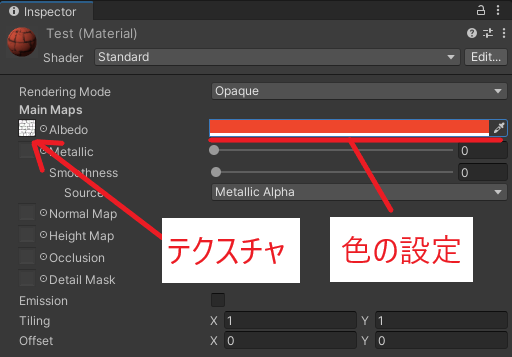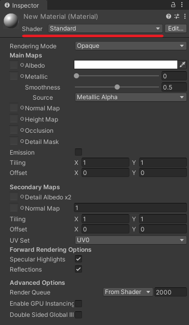 Inspector から Material の Shader を確認することができます。デフォルトでは、下の画像のように Standard という Material になっています。