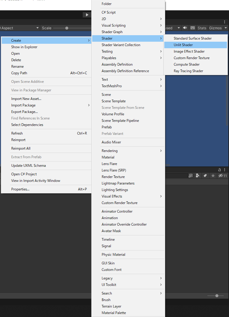 Assets 内で右クリック > Create > Shader から選択して、Shader を作ります。