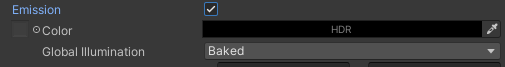 | Baked | このマテリアルからの発光は、シーンの静的ライトマップにベイクされます。そのため、近隣の静的ゲームオブジェクトはこのマテリアルによって照らされているように見えます。ライトプローブを使用している場合は、動的ゲームオブジェクトも影響を受けます。 |