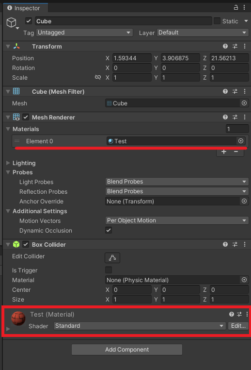 下の画像のように、Material の設定部分か Add Component に Material をドラッグ&ドロップすることで Material を変更することができます。