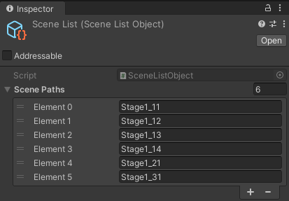 Scriptable Object である SceneListObject のインスタンスを生成し、シーン名を保存しています。保存先を "savePath" で指定しています。本記事ではアセット直下に "SceneList" という名前で保存されます。