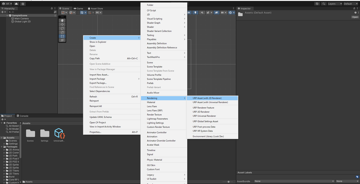 Project 内で右クリック > Create > Rendering > URP Asset(With 2D Renderer)をクリックすることでここまでができます。