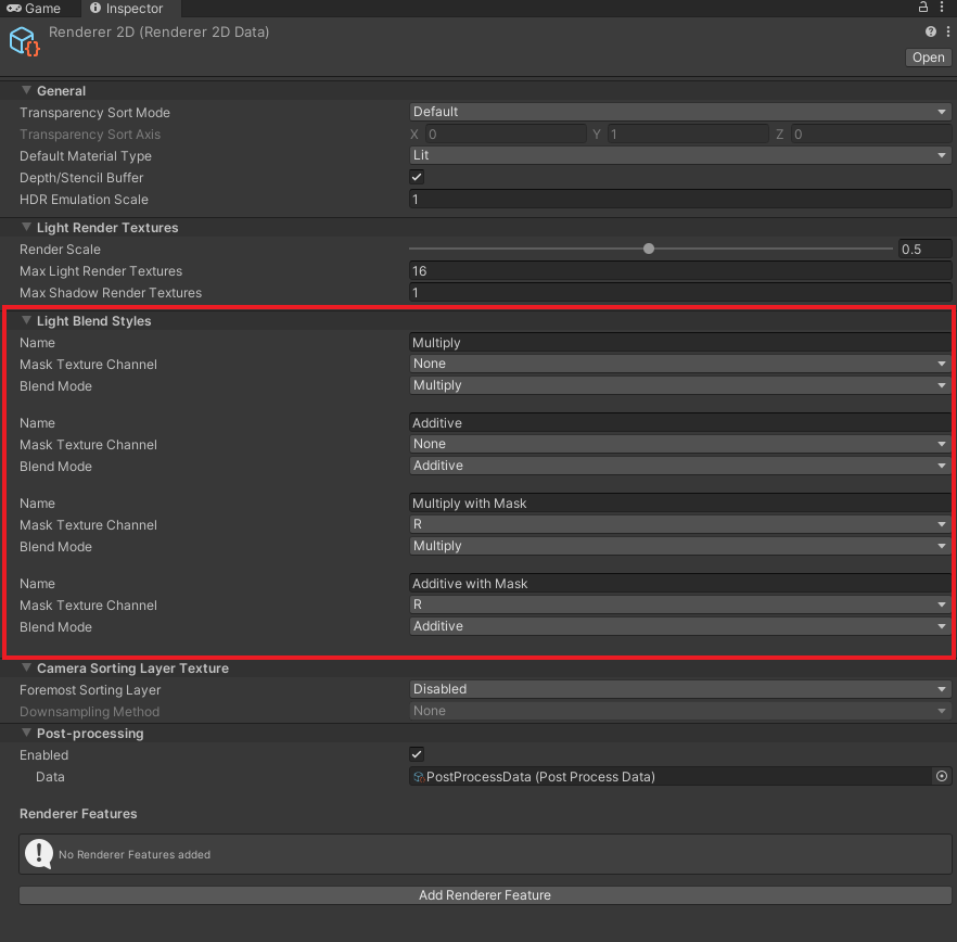 Multiply は乗算、Additive は加算です。with Maskは、マスクでライトがあたる場所をを制御できます。(R) と書いてあるのは、マスクテクスチャチャンネルを Red に指定しているからです。