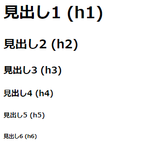 <!DOCTYPE html> <html lang="ja"> <head> <meta charset="UTF-8"> <title>見出しの例</title> </head> <body> <h1>見出し1 (h1)</h1> <h2>見出し2 (h2)</h2> <h3>見出し3 (h3)</h3> <h4>見出し4 (h4)</h4> <h5>見出し5 (h5)</h5> <h6>見出し6 (h6)</h6> </body> </html>