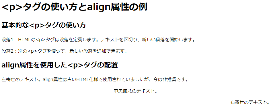 <!DOCTYPE html> <html lang="ja"> <head> <meta charset="UTF-8"> <title><p>タグの使い方とalign属性の例</title> </head> <body> <h1><p>タグの使い方とalign属性の例</h1> <h2>基本的な<p>タグの使い方</h2> <p>段落1:HTMLの<p>タグは段落を定義します。テキストを区切り、新しい段落を開始します。</p> <p>段落2:別の<p>タグを使って、新しい段落を追加できます。</p> <h2>align属性を使用した<p>タグの配置</h2> <p align="left">左寄せのテキスト。align属性は古いHTML仕様で使用されていましたが、今は非推奨です。</p> <p align="center">中央揃えのテキスト。</p> <p align="right">右寄せのテキスト。</p> </body> </html>