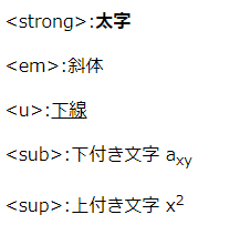 <!DOCTYPE html> <html lang="ja"> <head> <meta charset="UTF-8"> <title>下付き文字と上付き文字の例</title> </head> <body> <p><strong>:<strong>太字</strong></p> <p><em>:<em>斜体</em></p> <p><u>:<u>下線</u></p> <p><sub>:下付き文字 a<sub>xy</sub></p> <p><sup>:上付き文字 x<sup>2</sup></p> </body> </html>