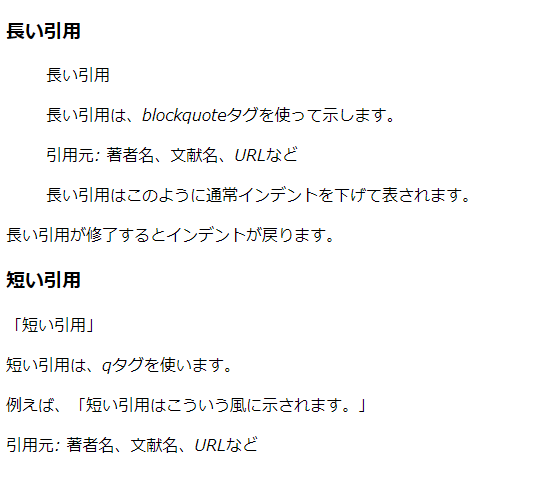 <!DOCTYPE html> <html lang="ja"> <head> <meta charset="UTF-8"> <title>引用の例</title> </head> <body> <h3>長い引用</h3> <blockquote> <p>長い引用</p> <p>長い引用は、<i>blockquote</i>タグを使って示します。</p> <cite>引用元: 著者名、文献名、URLなど</cite> <p>長い引用はこのように通常インデントを下げて表されます。</p> </blockquote> <p>長い引用が修了するとインデントが戻ります。</p> <h3>短い引用</h3> <q>短い引用</q> <p>短い引用は、<i>q</i>タグを使います。</p> <p>例えば、<q>短い引用はこういう風に示されます。</q></p> <cite>引用元: 著者名、文献名、URLなど</cite> </body> </html>