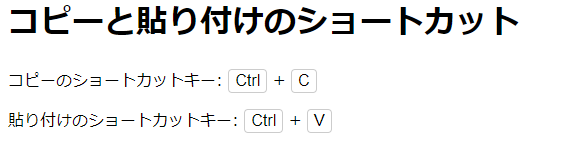 <!DOCTYPE html> <html lang="ja"> <head> <meta charset="UTF-8"> <title>コピーと貼り付けのショートカット</title> <style> kbd { display: inline-block; border: 1px solid #ccc; padding: 2px 6px; border-radius: 4px; font-family: Arial, sans-serif; } </style> </head> <body> <h1>コピーと貼り付けのショートカット</h1> <p>コピーのショートカットキー: <kbd>Ctrl</kbd> + <kbd>C</kbd></p> <p>貼り付けのショートカットキー: <kbd>Ctrl</kbd> + <kbd>V</kbd></p> </body> </html>